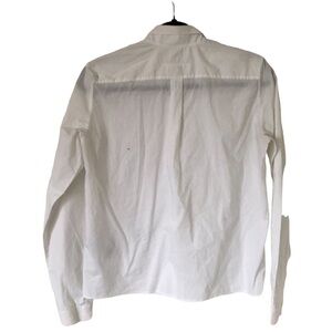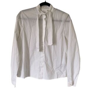 Long sleeve cotton poplin shirt in white. Band collar featuring integrated grosgrain self-tie fastening. Concealed button closure at front. Grosgrain trim at single-button cuffs. Tonal stitching.