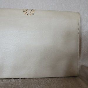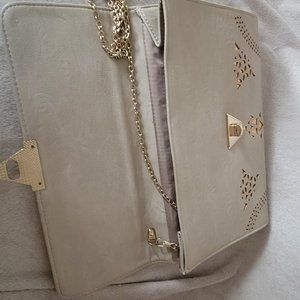 Gorgeous medium sized clutch purse, with gold chain strap can be used optional. Mint condition, no stains. Metal details, gold cutouts.