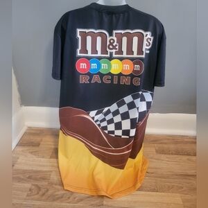 Bold M&M's racing graphic t-shirt with vibrant colors. Features a fun design with logos.