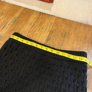 Chic black midi skirt with an openwork crochet knit and soft elastic waistband. Features a shorter solid black lining underneath for coverage and contrast. Feminine and cozy, easy to pair with boots or sneakers for a stylish cool-weather look.