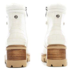 These are a pair of gorgeous White/cream leather/snake embossed Moda In Pelle Combat boots. Ski hook and inside zip closure.