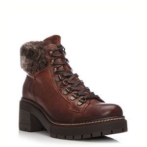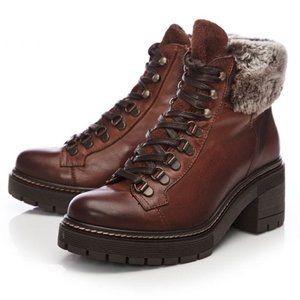 Beautiful winter combat boots with a suede tongue and a faux fur collar. Grommets and ski hook laces.