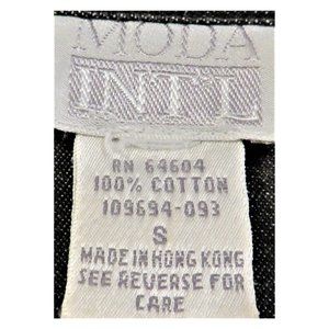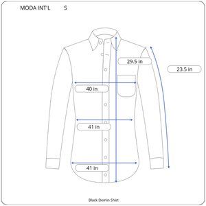 This 100% Cotton MODA INT'L Boyfriend Style Black Denim Shirt in Size Small has snap buttons and two front pockets. In very good condition with no flaws. Measurements in photos - note measurements taken flat and unstretched. Waist, Hip and armpit to armpit (chest) is then doubled.