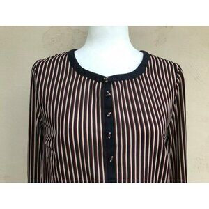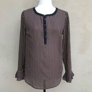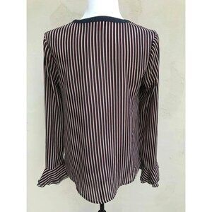 MODCLOTH Chiffon Blouse Size Medium Navy Blue Red Stripe Ruffle Trumpet Sleeves
