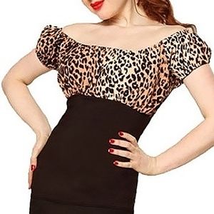 You'll be a sultry pin-up like Brigitte Bardot in this super RARE heart-stopping stretch bengaline off-the-shoulder wiggle dress with a lined leopard bodice. Stretchy black bengaline hugs and smooths your curves. Model photos are from Mode Mere website featuring variants which demonstrate the sexy fit of the Fancy Vamp wiggle dress.