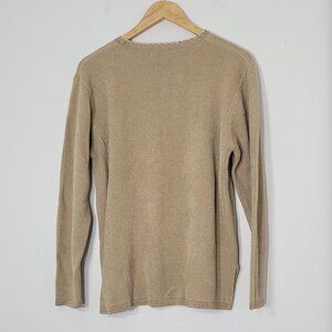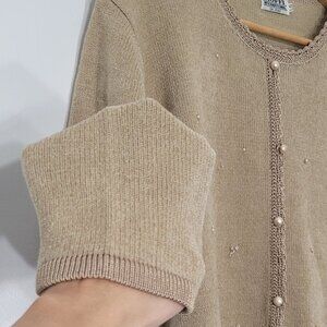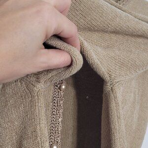 MOFFI Women's Tan Brown Embroidered Floral Button Knit Cardigan Crocheted Trim L