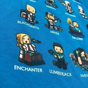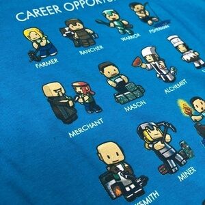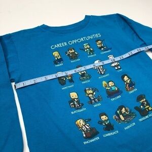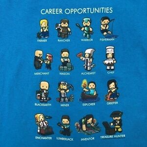 Mojang Mindcraft graphic long sleeve t-shirt in a bright solid blue color. The graphic reads career opportunities and pictures mindcraft characters dressed as different career characters. In great used condition expect for one very small hole on the front (see photo of me pointing to it). It is however so small that you can not see it when wearing it. Please see photos for measurements. Unisex boy or girl size 5/6.