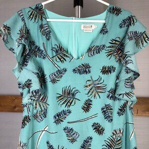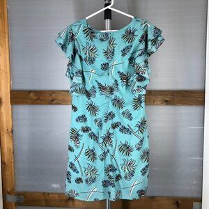 MOLLY BRACKEN Green Leaf Motif Lined Ruffle V Neck Dress Sz L