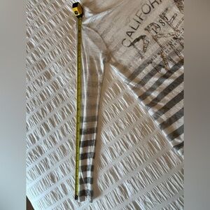 Monari soft white top with grey stripe has long sleeves and a scoop neck. 100% linen and has a distressed effect. The graphic "California Dreaming" is in metallic silver. There is also graphic of 1980 World Music Festival.