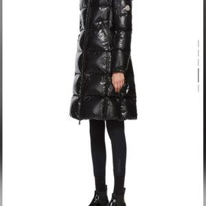 Long sleeve down-filled, coated, and quilted nylon coat in black. Stand collar. Two-way zip closure at front. Zippered pockets at waist. Flap pocket, zippered pocket, and multicolor felt logo patch at sleeve. Lined. Gunmetal-tone hardware.