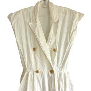 MONDI Vintage 100% Cotton White Pin Up/Rockabilly Style Midi Dress. Sleeveless with a collared v-neckline. Made in Germany. This vintage beauty features 2 rows of gold coloured buttons down front. Shoulder pads. Full Pleated A line style skirt with pockets. Not lined. Will require a good pressing. Classic in every way. A well loved vintage piece that will definitely turn heads when styled right.