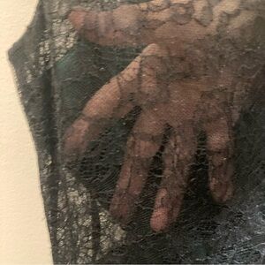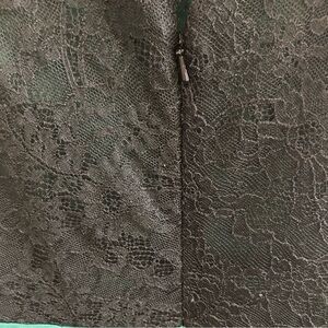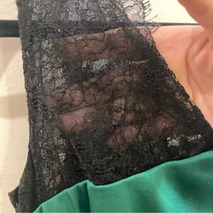 MONIQUE LHULLIER Sz 2 (estimated) Green Sheen Black Lace Top & Side Party Dress. Lovely cocktail dress. Perfect for a party, holidays, evening out, event. Size tag is missing. Please check measurements. Stretchy fabric.