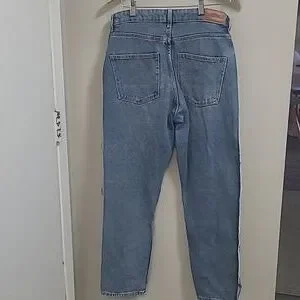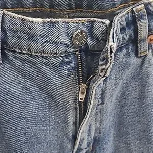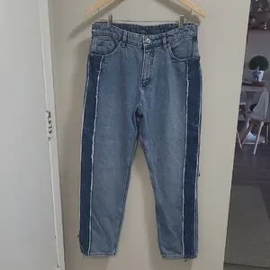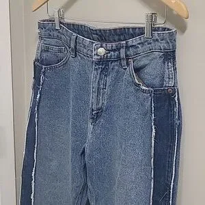 Stylish, high Rise,Straight, two-tone denim jeans with a unique design. Features a light and dark blue contrast.