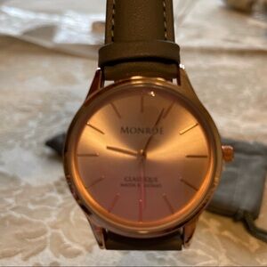 Elevate your style with the **MONROÉ Classique Watch**, featuring a stunning sunburst solérose dial and a sophisticated charcoal-colored genuine leather strap. This timeless timepiece combines elegance and functionality, making it perfect for both casual and formal occasions. With its durable design and chic aesthetic, the MONROÉ Classique Watch is a must-have accessory for fashion-forward individuals. Discover the perfect blend of luxury and everyday wear with MONROÉ.
