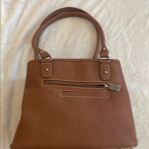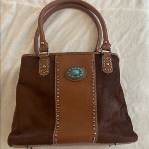 Trinity ranch ,featuring studded accents and hair -on hide fur design silver hardware and brown lining .with a country western theme studded bottom