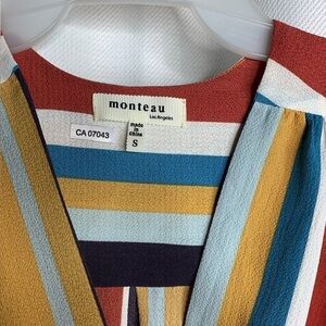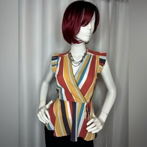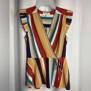 EUC Monteau Multicoloured faux wrap top with peplum bottom and fluttered cap sleeves.