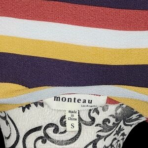 Monteau Women's Striped Wrap Top. Featuring vibrant stripes in red, yellow, blue, and white, this top is perfect for any occasion. The wrap design adds a flattering touch.