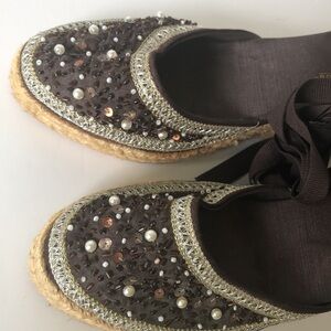 Montego Bay Club Brown Espadrilles Wedge Sandal. Size 7.5. Minimal wear. Tie at the ankle. Beaded details on the toes. A bit of showing on the rope bits and a little piece that is a bit stray on one heel. You can see this in the photos.