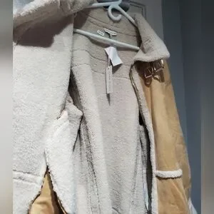 BRAND NEW WITH TAGS* This beautiful jacket is a non stretch faux leather with buckles at the neck and welt hip pockets. Sherpa lined. Fits oversized