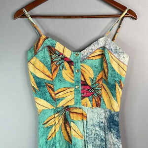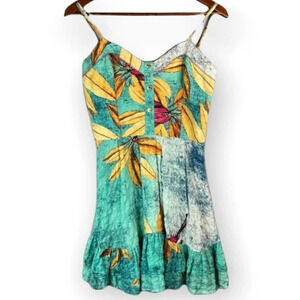 Ladies teal green and mustard Morena Rosa Hawaiian Tropical floral print sweetheart neckline ruffled trim spaghetti strap sun mini dress.