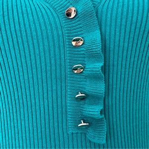 This adorable ribbed sweater is a beautiful green colour and features a ruffled collar on a Henley neckline and decorative gold buttons. This is a great quality piece in excellent condition.