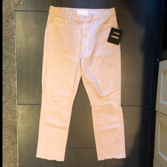 These MOTHER jeans have never been worn and include the original tags (and iron on patch!). These are a super fun pair of jeans for summer, and the light pink is a great pop of colour for any jean collection. They are a distressed look and have rips at the knee and close to the ankle! Size 32 but they do fit small