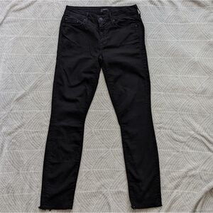 Pet smoke free, in excellent preloved condition, Mother Denim THE LOOKER ANKLE FRAY row hem black jeans 24 skinny jeans in a best selling black wash.