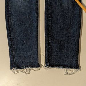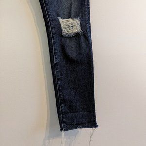 Shredded knee, raw-edge hems, ankle length skinny silhouette