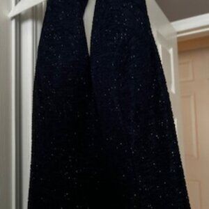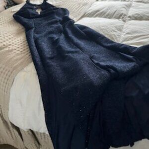 This dress is truly captivating, designed to make a statement with its flowing silhouette that beautifully drapes over the body. The neckline is exquisite, adding an elegant touch that catches the eye. Crafted from a luxurious fabric with a soft sheen, the deep blue color is enhanced by subtle shimmer undertones, creating an aura of sophistication and allure. BUT TODAY AND GET THE BLUE SUEDE BOOTS THAT MATCH!