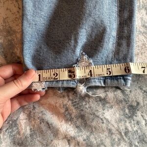 Beautiful cropped denim jeans by the brand MOTHER, from their Superior capsule line. Features a light wash with heavy intentional distressing all over as well as busted distressed knees and a button fly.