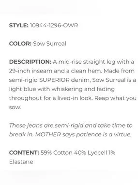 Inseam: 28.5" Rise:9.5" Waist across: 15.5"