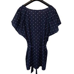 Navy blue top with polkadots (pink, or possibly a pale purple). Tie around the waist.