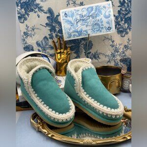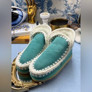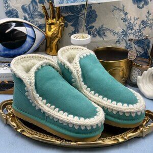 🆕 MOU 🧿 NWT WOB Teal Eskimo Ankle Boot, Cream Crochet Overstitch, Sz EU 35