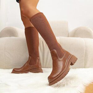 🆕 MOUSSE FIT Women's Brown Knee High Lug Sole Boots, Chunky Heel, Rubber