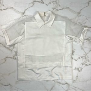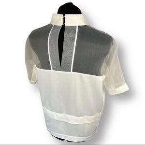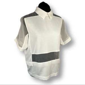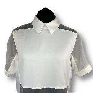 Features satin-like and taffeta fabrics brought together in geometric shapes to create the illusion that it’s holding itself up! Collar with clasps, and beautifully tailored