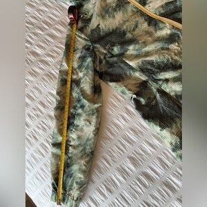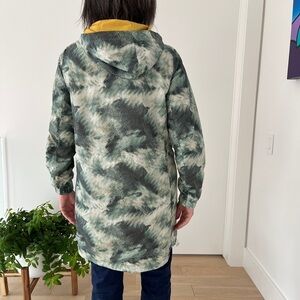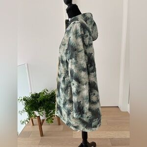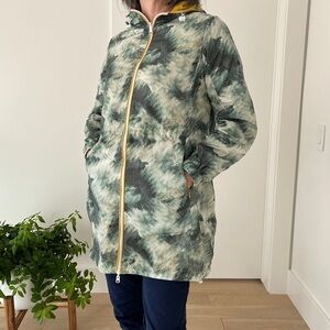 MPG reversible jacket gives you multiple looks in one coat. One side is yellow and the other is a green and white abstract pattern. Both sides have zipper pockets and there is a drawstring at the bottom and on the waist, so you can wear it as more of an A line coat, or cinch the drawstring for a more defined look. Hood and full zip.