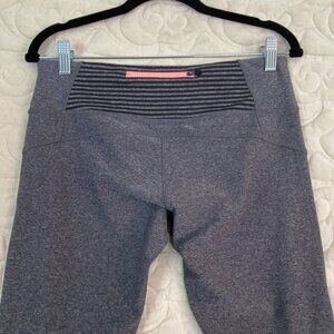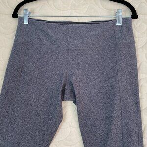 MPG Yoga Capri Leggings. Women's tag size Medium (actual measurements in photos - taken unstretched). Polyester / spandex blend. Lots of all over stretch. Heather gray with striped calf and hip detail. Zippered pocket in back.