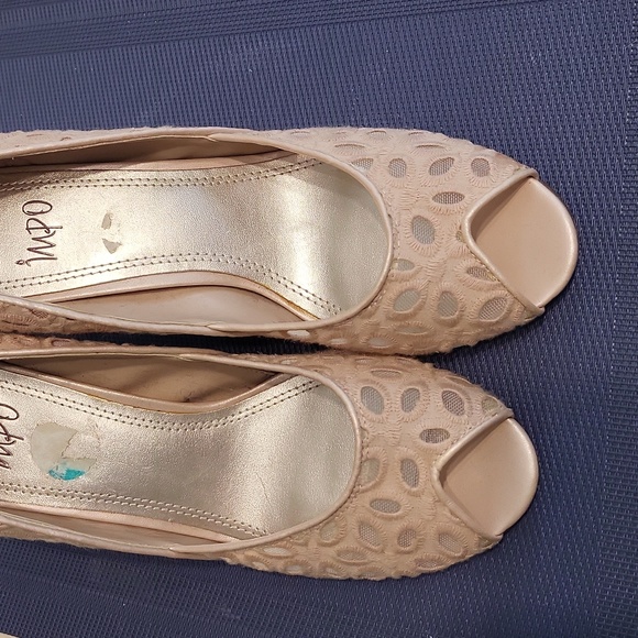These are lovely wedding shoes or evening shoes MPO brand. Size 8M . Worn only once at a resort wedding. The heels are satin. The little designs or holes in the design have mesh inside of them. Gorgeous shoes. Reasonable offers welcome.
