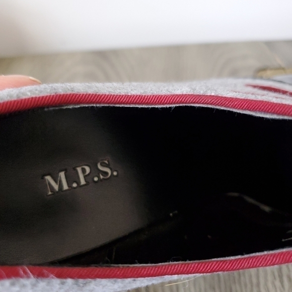 Unique and stylish heeled booties with elasticized top and wool sides.Red embellishments. Fantastic condition. size 8.5