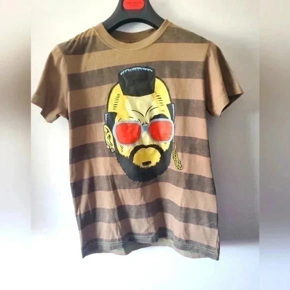 Mr. T is still so rad. This striped T shirt featuring Mr. T is in excellent condition. It would fit a men's small, a boys Xl or a woman medium.