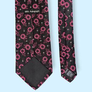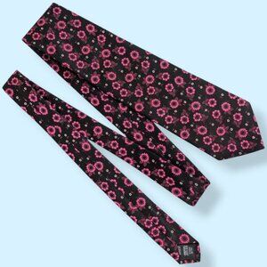 This tie by Marks & Spencer is made of 100% silk and is black with pink sunflowers and small white accents. The interior of the tie is black and dotted. There is a tag inside the end of the thin end that lists material content and a maker's tag on the back of the thick end (that can be used to secure the thin end). The tie has some wear but is in good condition overall.
