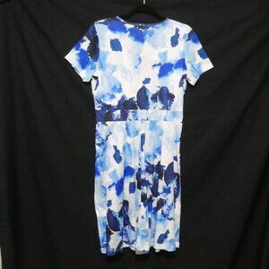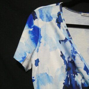 Elegant blue and white floral dress with a wrap neckline and short sleeves