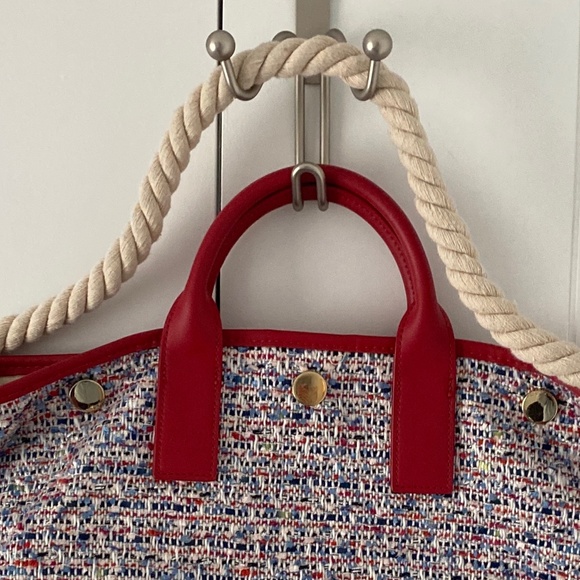 Your perfect summer bag with French vibes! This stylish bag is generously sized to cover all your day to day needs. Made from a chunky textured material, it features contrasting straps that lend a pop of colour to your outfit. Carry it as a tote bag or wear it on your shoulder using the rope shoulder strap. Two inside pockets, including one zipped compartment