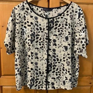 Petite XL - short sleeve blouse. Mix of taupes, grey, white and black spotted pattern. Black trimming. Striking and versatile blouse. Fabric has some stretch.