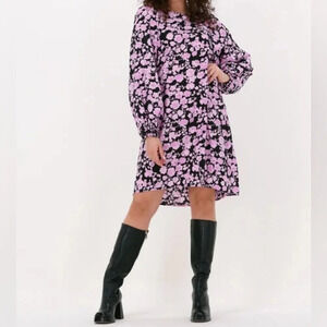 MSCH Copenhagen Women's Ladonna LS Floral Balloon Sleeve Black Pink Dress Size Large.