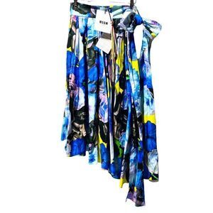 MSGM WOMEN'S FLORAL SKIRT WITH BOW IN SHADES OF BLUE. Gorgeous structured pleated skirt, assymetrical cut that hits above the ankle on one side. Full volume with waist belt to tie any way you're feeling. Vibrant floral print in shades of blue and purple with yellow highlights. Total show stopper!