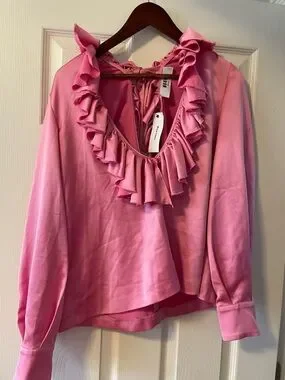 Lightweight pink blouse with distressed fringe ruffle trim along a deep V-neck. Long sleeves with soft cuffs. Tie detail at the back neckline. Feminine silhouette ideal for layered looks.