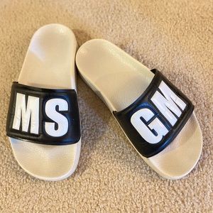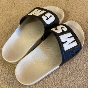 Rubber slip-on sandals featuring gradient in black and white. Open round toe. Logo embossed in white