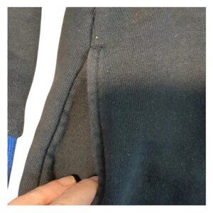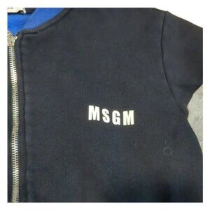 An MSGM zip-up sweatshirt. It's primarily black with blue ribbed cuffs and collar, and gray sleeves. The MSGM logo is visible on the right chest. MSGM is an Italian brand founded by Massimo Giorgetti known for its vibrant sportswear and contemporary designs. These sweatshirts are made from cotton and feature long sleeves and a full frontal zip.