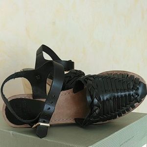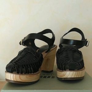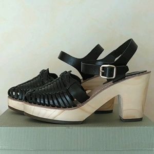 One part huarache, and one part clog, the MTNG Vaqueta Leather Clogs are 100% cute! Woven genuine leather upper includes an adjustable ankle strap, propped on a lightweight wooden platform. Gold hardware. Size 38. New with tags.
